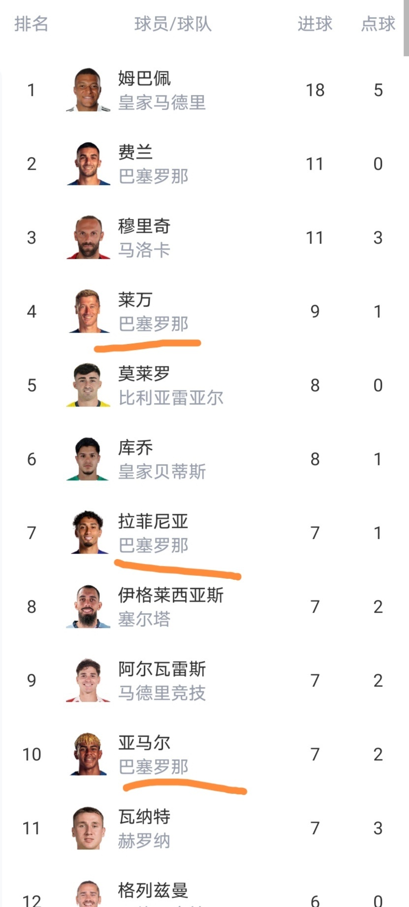 射手榜上姆巴佩遥遥领先,莱万已经打入了9球,拉菲尼亚已经打入了7球,亚马尔已经打入了7球,格列兹曼已经打入了6球,不过他们对比姆巴佩来说,进球数量还是太少了。姆巴佩本赛季剑指西甲金靴了。
