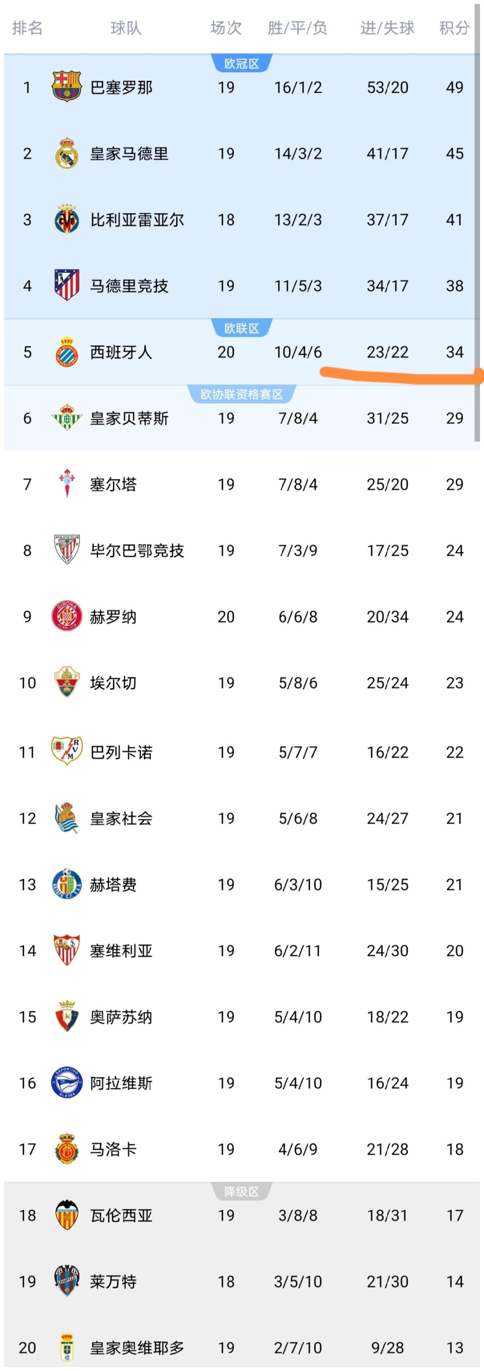 可以看到西班牙人0-2输球之后,积34分排在第5的位置,距离第4的马竞4分差距,而且西班牙人多赛一场,可见西班牙人争夺欧冠席位还是不容易的,马竞这座大山也不是那么容易跨越的。而赫罗纳队赢球之后,赫罗纳队积24分升至了第9,赫罗纳队排名上升了4位。此外巴萨以4分优势领跑。瓦伦西亚继续沉沦,在降级区徘徊,令人唏嘘不已。