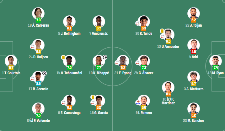 皇家马德里(4-3-3):库尔图瓦;巴尔韦德,劳尔-阿森西奥(90'阿拉巴),赫伊森(61'塞瓦略斯),卡雷拉斯;卡马文加(46'居莱尔),琼阿梅尼,贝林厄姆;冈萨洛-加西亚(46'马斯坦托诺),姆巴佩,维尼修斯