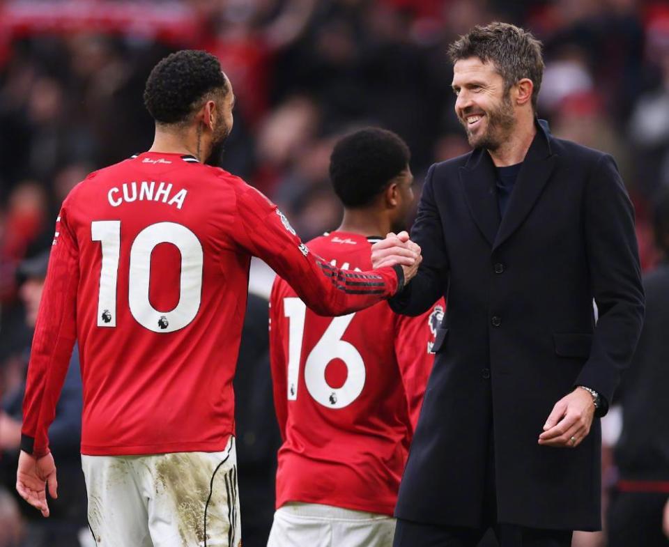 在解雇阿莫林后,曼联在曼市德比战前,敲定了新帅卡里克,在自己的首秀中,卡里克让红魔变阵四后卫,并且高举防守反击的大旗,直接在梦剧场压制住了蓝月军团,在3粒进球因为越位被吹的情况下,仍然靠着姆伯莫和多尔古的进球,2-0复仇曼城。