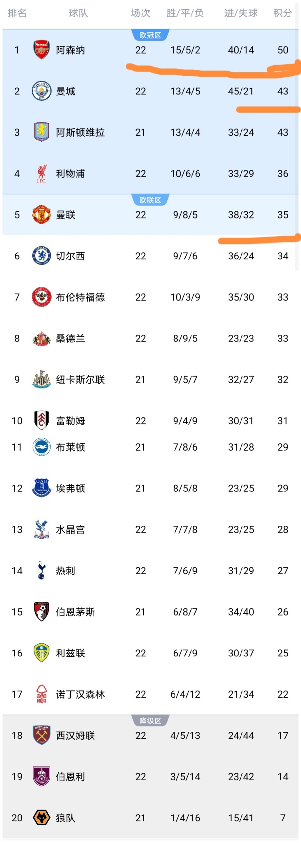昨晚至今天凌晨,英超第22轮结束多场较量,曼城、曼联、阿森纳等队出战,我们来看看这些比赛之后英超积分榜情况。