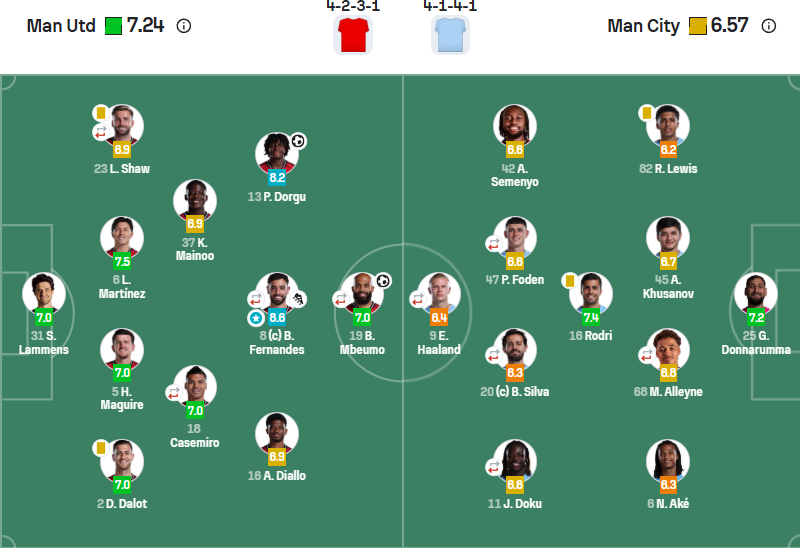 第一阵型回归传统,强调宽度与防守。卡里克果断放弃了阿莫林偏爱的三中卫体系(3-4-2-1),回归曼联更为熟悉的4-2-3-1阵型。这一改变迅速稳定了防守,两个边后卫的职责变得明确,同时也释放了边锋阿马德和边后卫多尔古的进攻天赋。