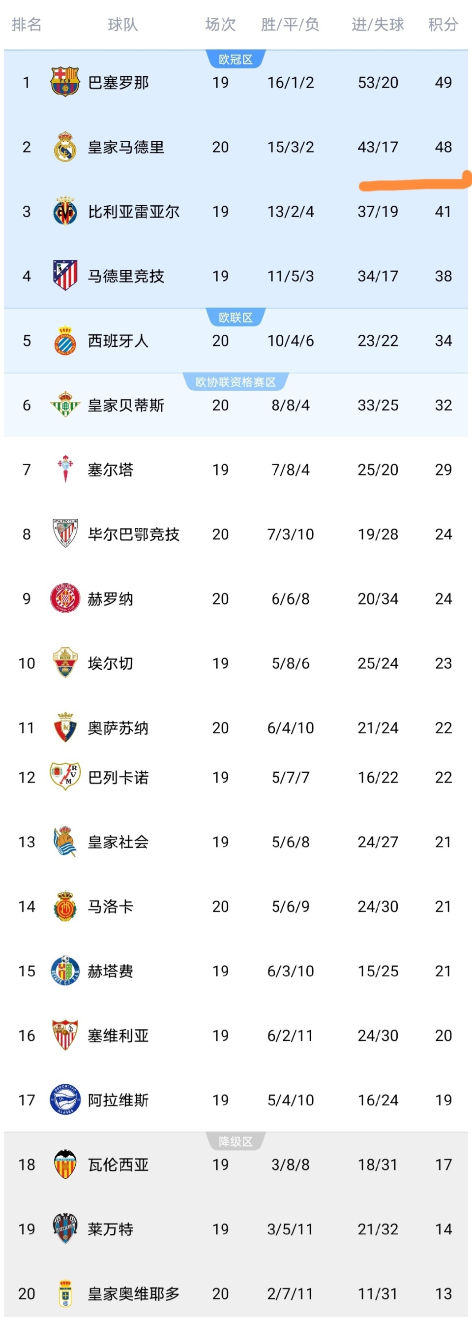 昨晚至今天凌晨,西甲第20轮又结束4场较量,皇马、贝蒂斯、比利亚雷亚尔等队出战,我们来看看这些比赛之后,西甲积分榜的变化。