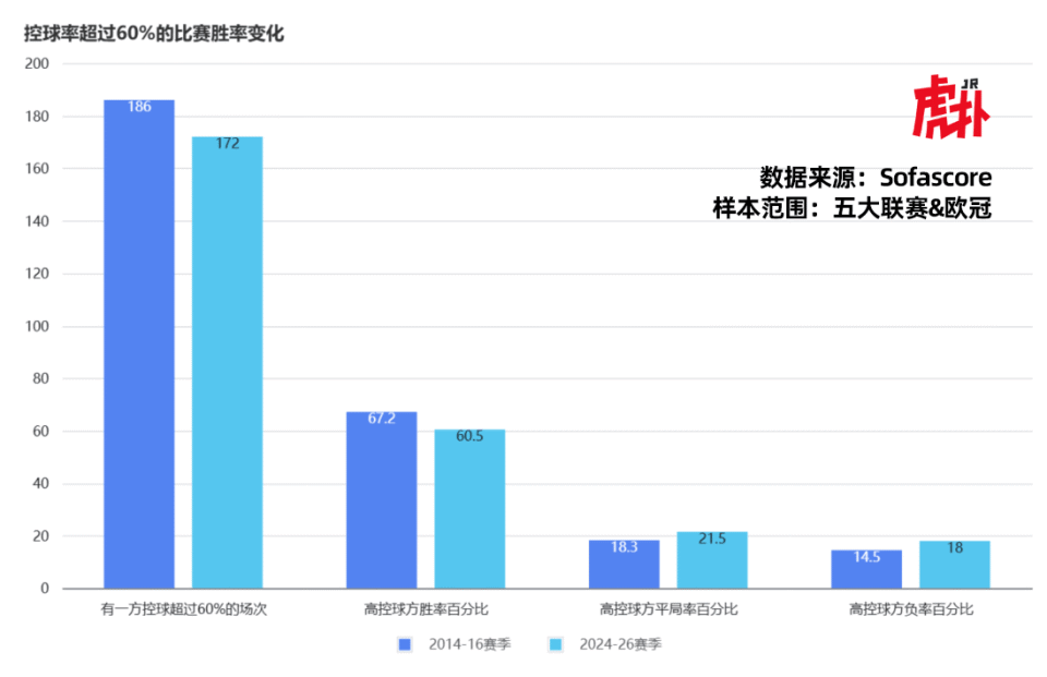 十年前(2014/15和2015/16赛季)的数据显示,控球率≥60%的球队胜率高达67.2%。但随着战术理念的迭代,这一格局已发生根本性改变。在最近两个赛季(2024/25-2025/26赛季)的相同统计标准下,高控球方胜率降至60.5%,负率则从14.5%升至18.0%。