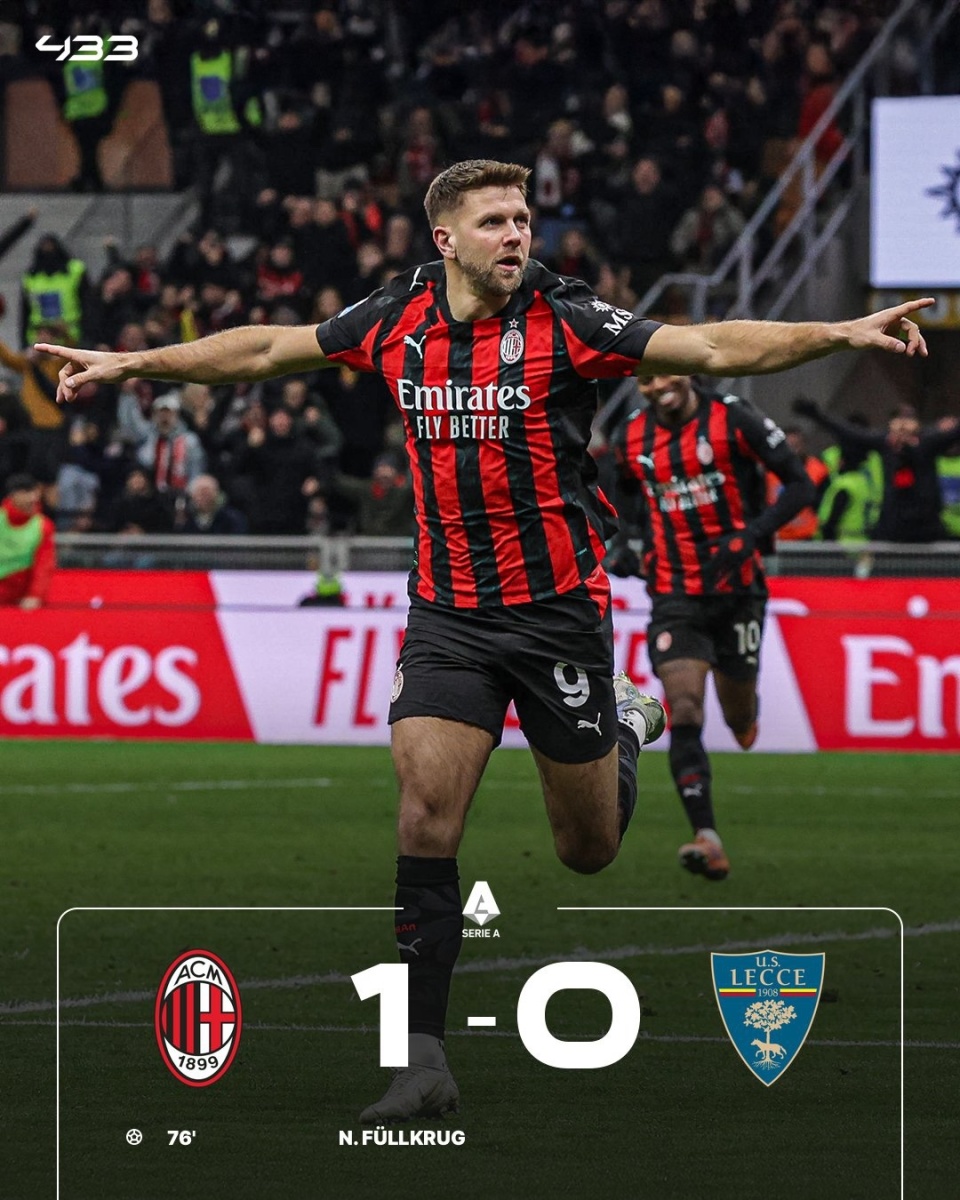 意甲第21轮,AC米兰1-0击败莱切,取得联赛两连胜,距离榜首还有3分差距。莱奥进球被吹越位在先,替补上场的菲尔克鲁格打进他在米兰的处子球。