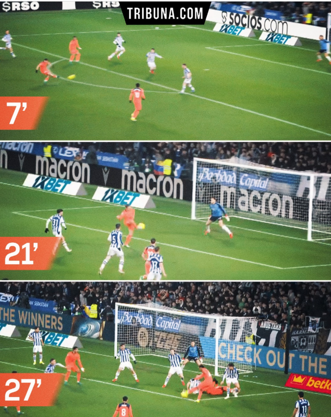 巴萨持续压制,皇家社会被迫在禁区前苦苦支撑。