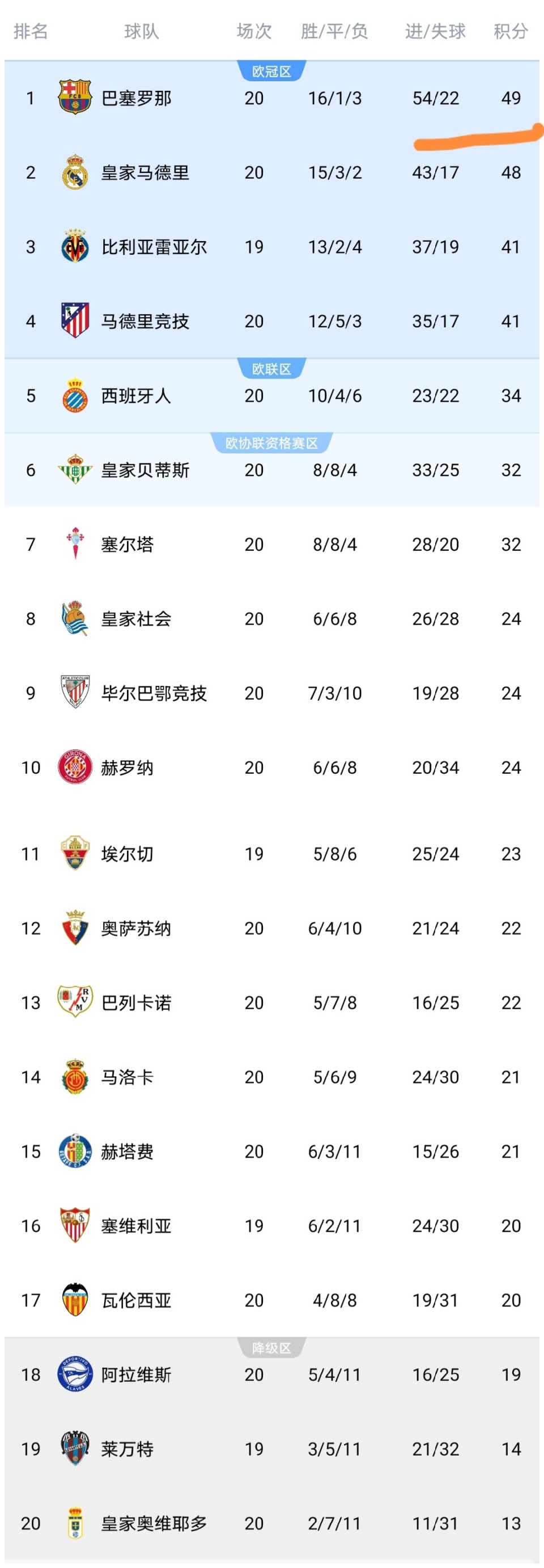 可以看到巴萨在爆大冷门输给皇家社会队之后,积分还是停留在了49分,目前巴萨和皇马都是踢了20轮,巴萨仅领先皇马1分,皇马缩小了与巴萨的分差,这显然要感谢皇家社会队啊。皇马做好自己的同时,还得靠其他球队来阻击巴萨,皇马才有反超的机会。而马竞击败阿拉维斯之后积41分继续排名第4,而比利亚雷亚尔少赛一场积分跟马竞一样,同时仅差皇马7分,如果比利亚雷亚尔少赛的那场赢了,就仅差皇马4分。可以说巴萨、皇马、比利亚雷亚尔、马竞都有争冠的希望。