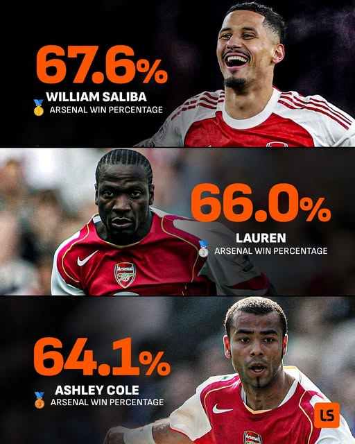 根据Livescore统计,在阿森纳队史所有出场超过100场的球员中,萨利巴的胜率是最高的,达到67.6%。
