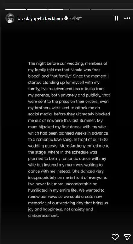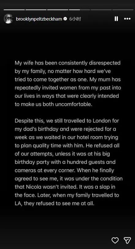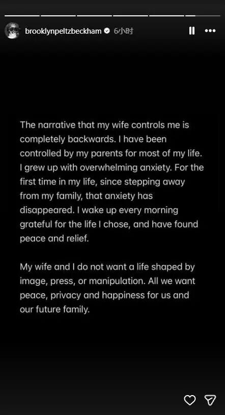 在一家人的矛盾闹到人尽皆知之后,据多家外媒报道,贝克汉姆(David Beckham)的大儿子布鲁克林(Brooklyn Peltz Beckham)在当地时间19日发文控诉亲爸亲妈。