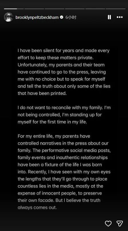 结论和很多人猜测的一样,布鲁克林指责父母操控舆论:“我的父母一直通过作秀般的社交媒体帖子、家庭活动和虚假的人际关系来控制媒体对我们家庭的报道。最近,我亲眼目睹了他们为了维护自己的形象,不惜在媒体上散布无数谎言,而这些谎言大多是以牺牲无辜者为代价的。”