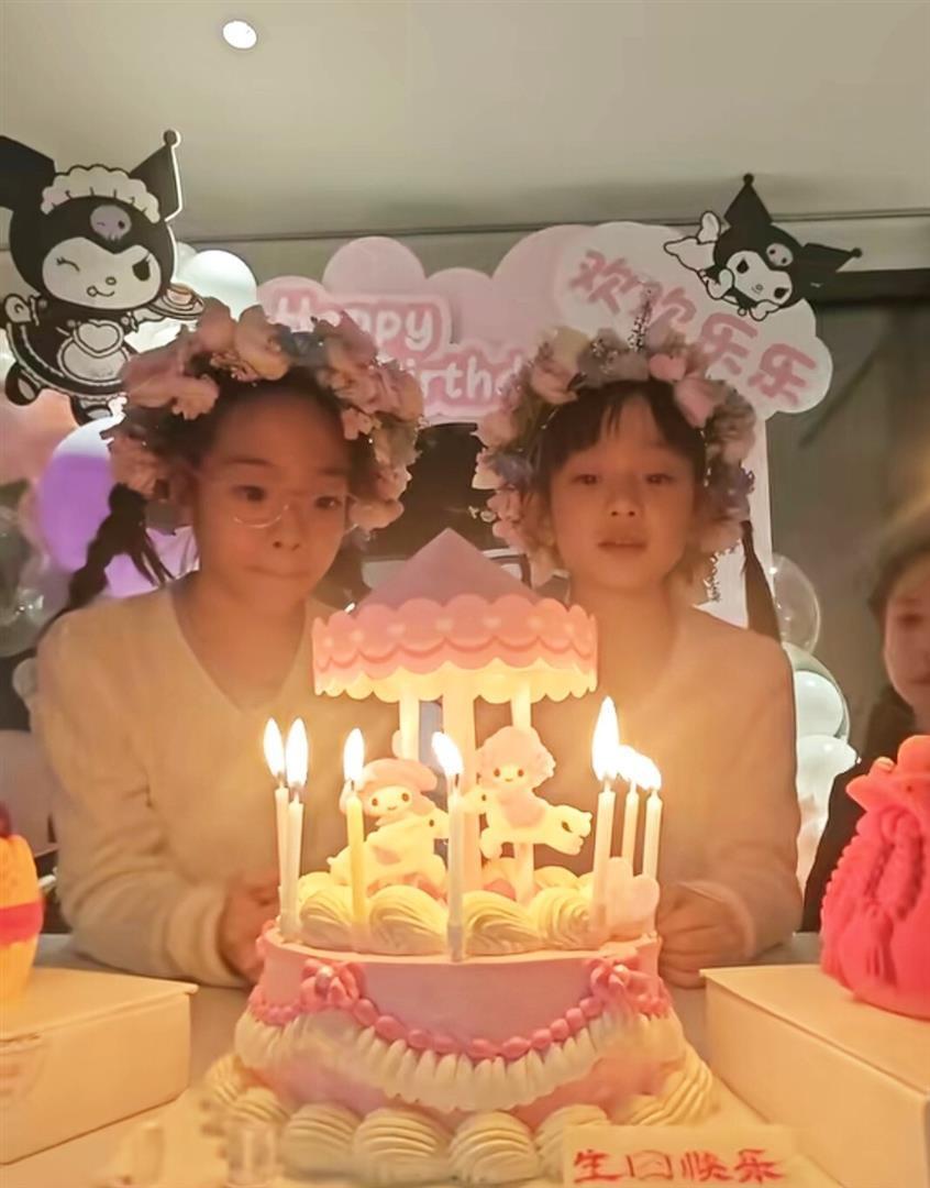 杨威和杨云这次真是下了功夫。 派对就在他们家宽敞的客厅里办的,根本不用去外面酒店。 头天晚上,夫妻俩就悄悄开始布置。 整个背景墙是蓝紫色的,全是气球,中间立着巨大的库洛米图案玩偶。 地上堆满了五颜六色的礼物盒,都是家人和朋友送的。 桌子上,一字排开摆了三个生日蛋糕,每一个都精致得不像话,插着小蜡烛。 欢欢和乐乐头上戴着白色的小花环,穿着可爱的小裙子,往气球墙前面一站,笑得眼睛都弯成了月牙。