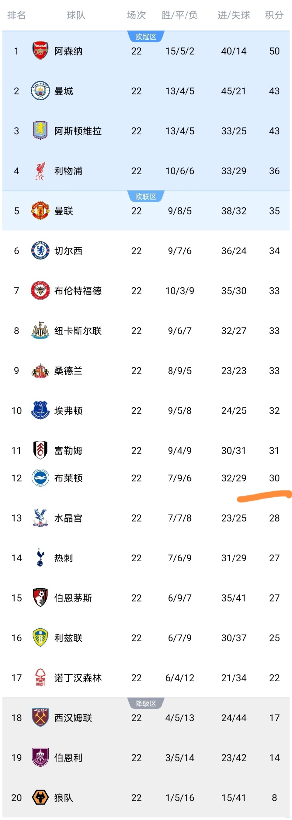 今天凌晨,英超第22轮结束了最后一场的较量,布莱顿出战,这场较量之后,英超所有球队都已经踢完了第22轮的比赛,英超积分榜随之更新,我们来看看。