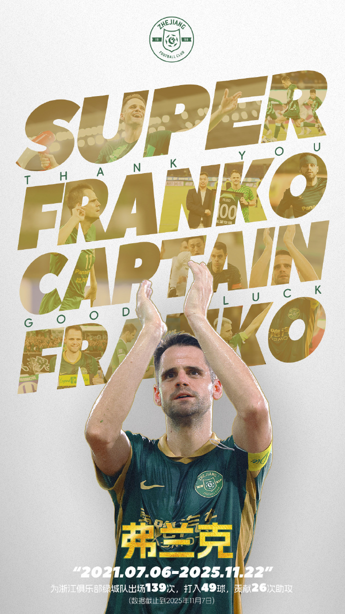 浙江俱乐部官方宣布球队队长弗兰克将在本赛季结束浙江生涯,11月22日收官战后为其举办告别仪式。详细>>