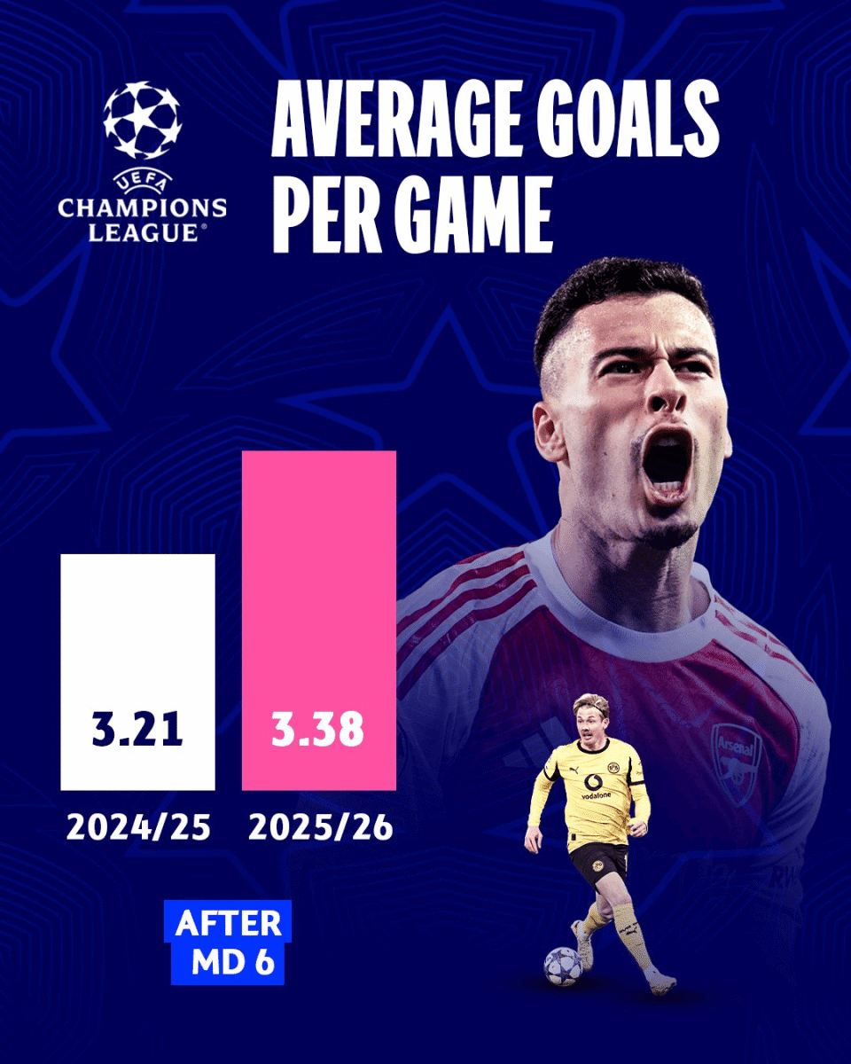 本赛季欧冠在前六轮里,场均能够产生3.38个进球。