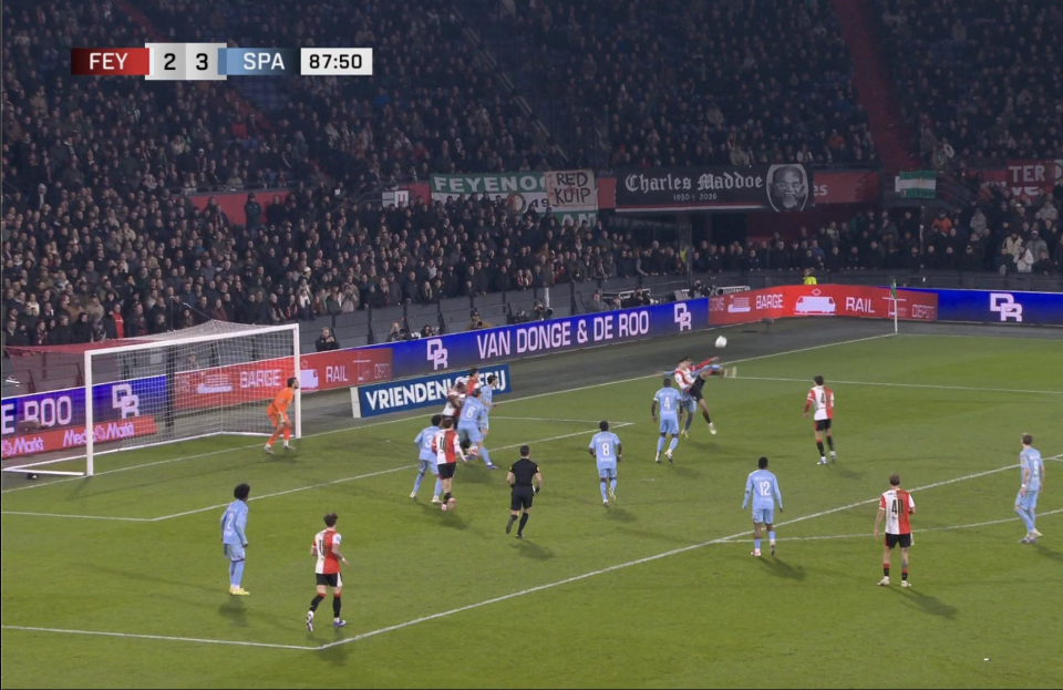 第87分钟,费耶诺德将球吊入禁区。沙奎尔高高跃起,在背对球门的情况下完成了一记极其漂亮的倒钩射门,皮球直挂网窝,将比分追至3比2。这一进球方式,瞬间让无数球迷想起他父亲职业生涯中那些标志性的凌空破门。