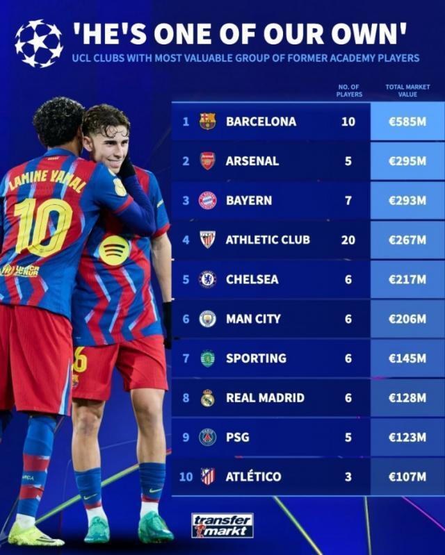 1月20日讯 德国转会市场统计了欧冠俱乐部之中自家青训球员的身价,并列出榜单,巴萨居首,阿森纳、拜仁前三。