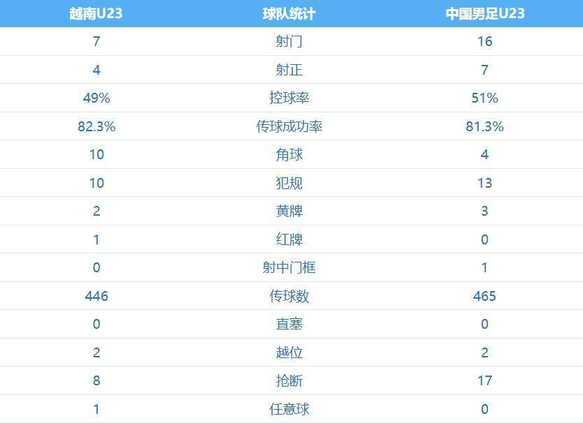 全场比赛,国足的控球率为51%,一共有16次射门,是越南7次射门的2倍多,国足有7次射正,也比越南多出3次,此役国足是完胜越南。
