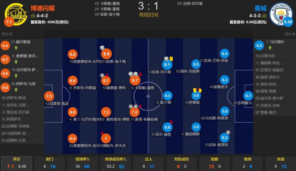 博德闪耀vs曼城,博德闪耀方面442阵型,首发身价4260万欧元;瓜迪奥拉此役排出433阵型,哈兰德突前,两侧是福登和谢尔基,赖因德斯、罗德里、刘易斯组成三中场,奥赖利、阿莱恩、胡桑诺夫、努里组成四后卫,多纳鲁马守门,首发身价6.66亿欧元。