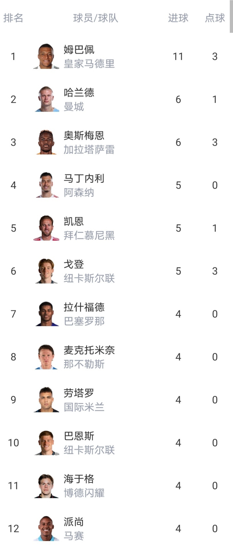 射手榜姆巴佩进球上双了,哈兰德第二。