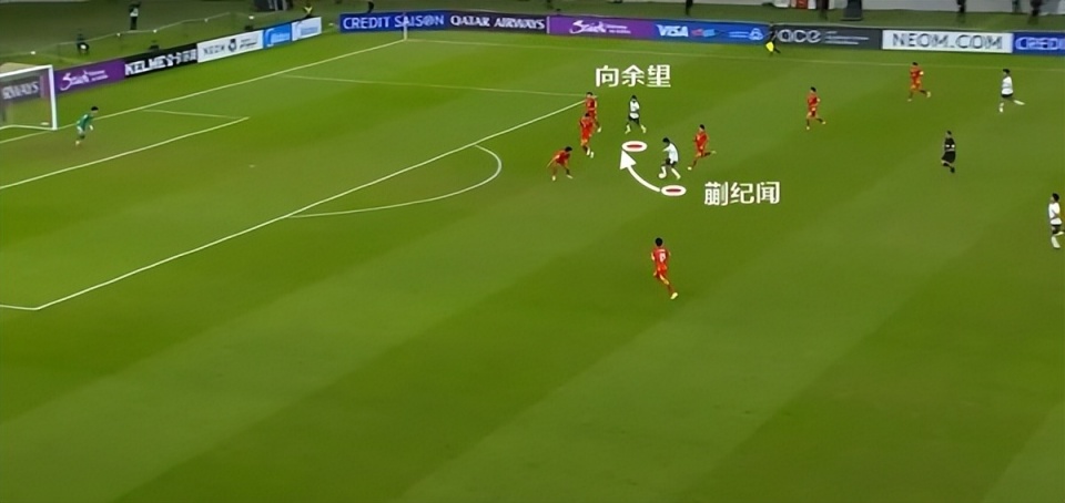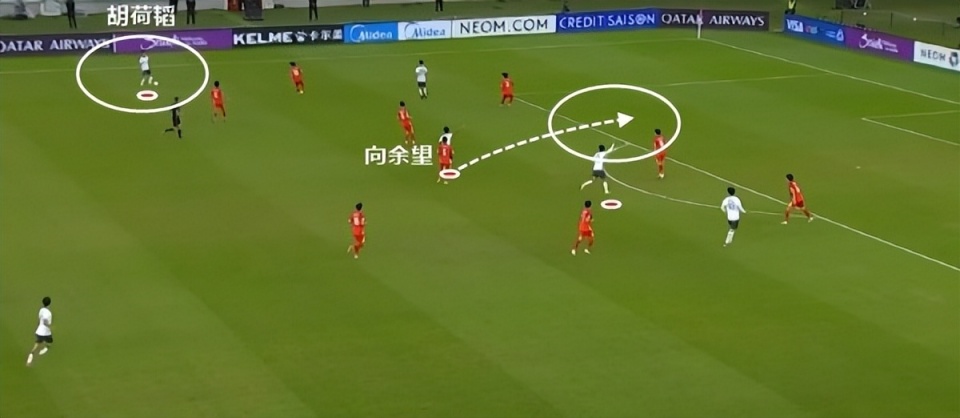 蒯纪闻和向余望都有较大的活动范围,于是就能找到机会回撤拿球,随后分球给到越南队防守盲区的右边路(也就是U23国足的左边路)。
