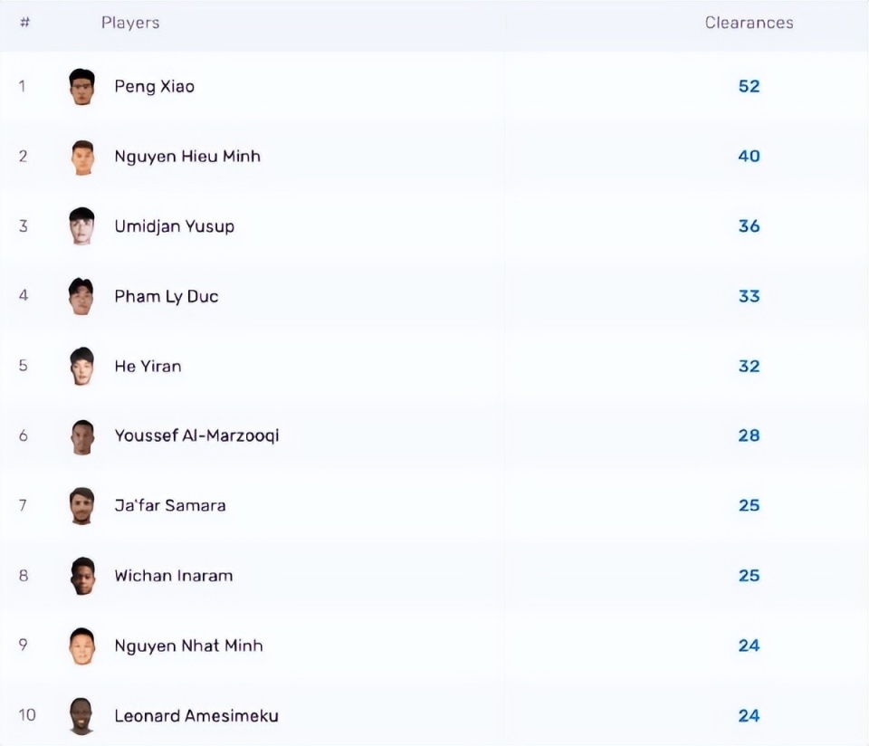 从榜单上可以看到,踢了5场的彭啸贡献了52次解围,领先第二名12次,比队友吾米提江多出了16次。