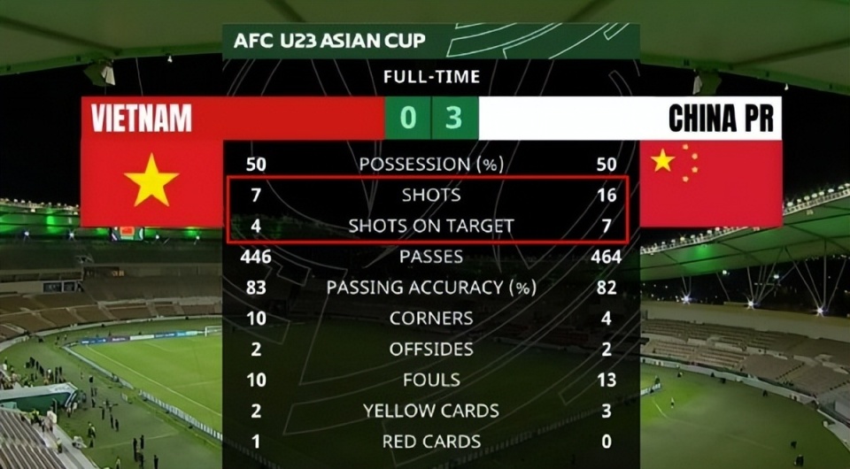 从统计数据可以看到,U23国足全场获得了16次射门机会,其中12次射门和7次射正,以及3个进球都出现在下半场。