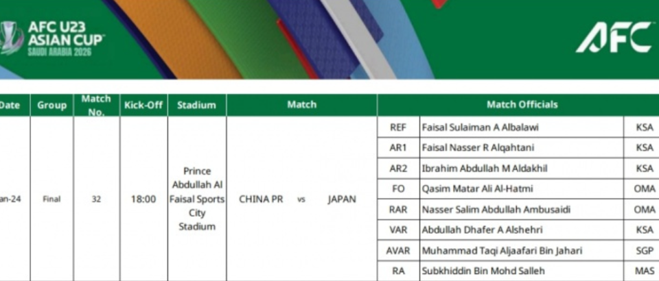北京时间1月21日,亚足联官方渠道发布了U23亚洲杯的比赛安排。沙特主裁判费萨尔-苏莱曼-A-阿尔巴拉维将执法本场比赛,第一和第二助理裁判同样来自沙特,第四官员则来自阿曼。这就意味着,届时中国U23国足又将面临西亚裁判组的执法,但愿这不会对比赛造成消极的影响。
