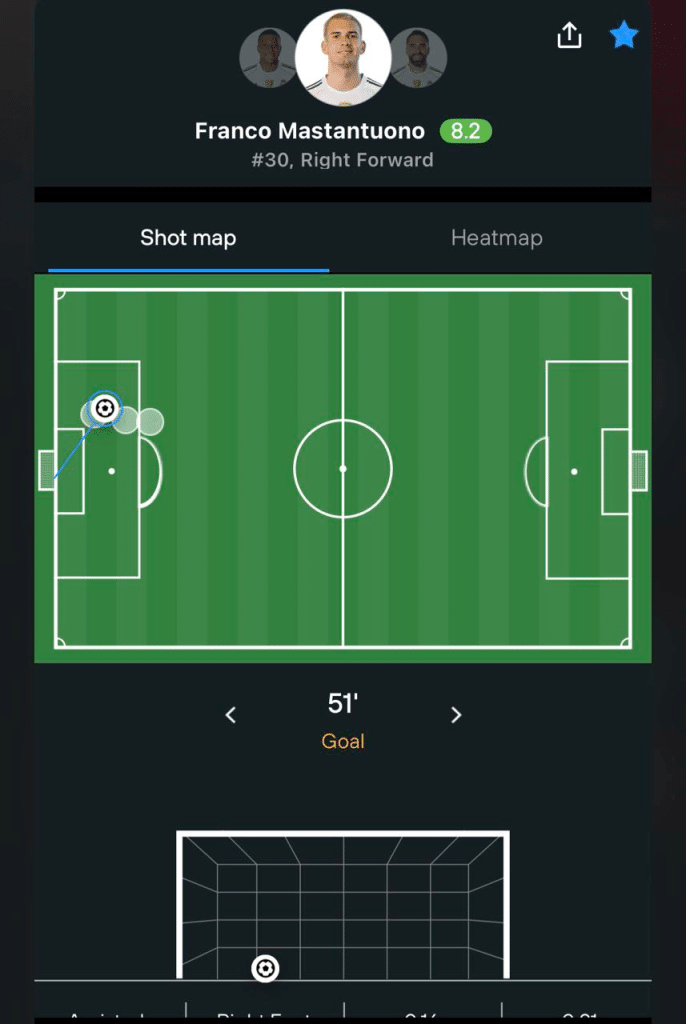马斯坦托诺的进球出现在第51分钟,他接到维尼修斯的直塞,用一脚干净利落的左脚完成终结,没有多余动作,也没有犹豫,那一刻更像是一种确认——他知道自己该在什么位置、用什么方式结束这次进攻。