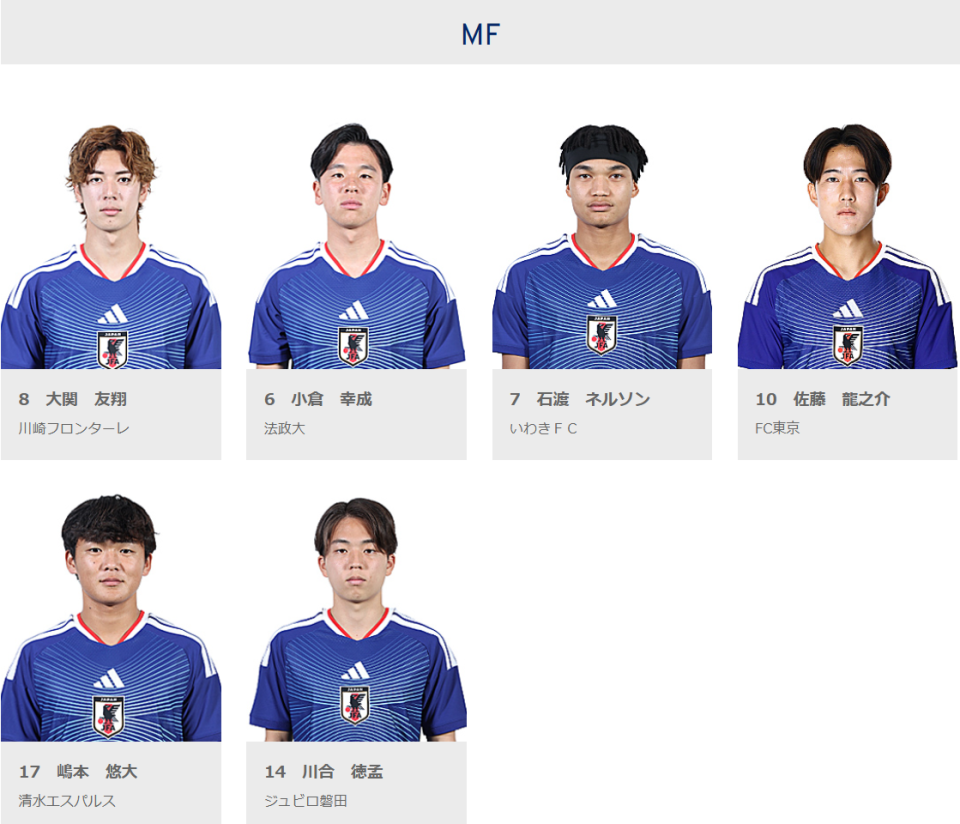 根据日本足协在去年底公布的U23亚洲杯名单显示,日本队23人名单中有门将滨崎知康(明治大学),后卫小泉佳弦(明治大学)、关富贯太(桐荫横滨大学)、冈部·塔里克卡尼·飒斗(东洋大学),中场小仓幸成(法政大学),前锋古谷柊介(东京国际大学)、久米遥太(早稻田大学)和恩瓦迪克·乌切·布莱恩·世雄(桐荫横滨大学)这8人。