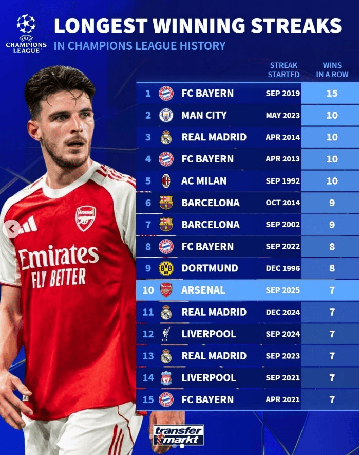 欧冠历史最长连胜纪录:拜仁15连胜居首,阿森纳7连胜进前十