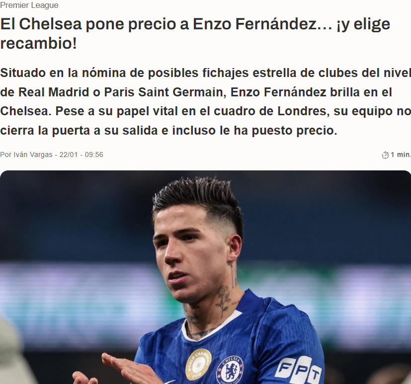 皇马目前的教练是阿韦洛亚,他上任后并没有提出引援要求,但这并不意味着阿韦洛亚对现有的阵容没有想法。等到夏天皇马肯定会着手填补阵容短板,现在他们已经知道了切尔西对恩佐-费尔南德斯的标价,等到合适的机会出现,皇马就会正式出手了。