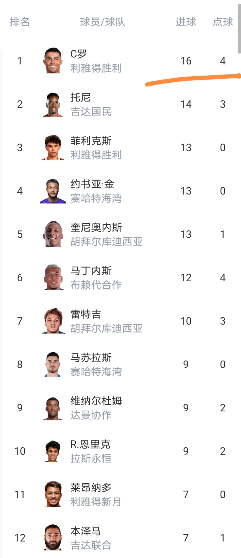 射手榜C罗进球数上涨到了16球,以2球优势领跑。
