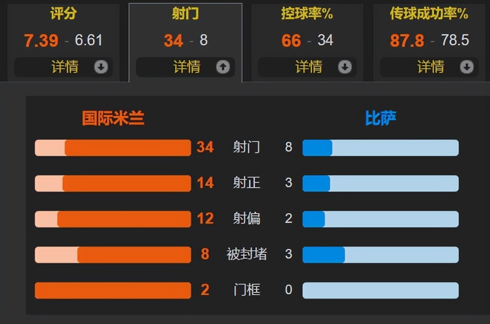 全场比赛,国际米兰的控球率为66%,一共有34次射门,其中14次射正;比萨一共有8次射门,其中3次射正。