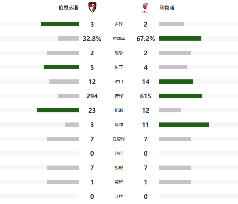 第26分钟,伯恩茅斯中场挑传禁区右侧底线附近,范戴克解围失误,斯科特底线前将球勾回,埃瓦尼尔森跟进抽射破门,伯恩茅斯1-0领先。戈麦斯门前拦截时与阿利松相撞受伤无法坚持,最终被远藤航换下。