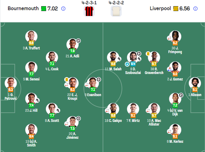 伯恩茅斯:1-佩特洛维奇、5-塞内西、15-亚当·史密斯、23-詹姆斯·希尔、20-阿莱克斯·希门尼斯(85’27-托特)、3-特吕费尔、4-库克、8-斯科特、21-阿德利、9-埃瓦尼尔森(91’26-于纳尔)、22-克鲁皮(67’10-克里斯蒂)
