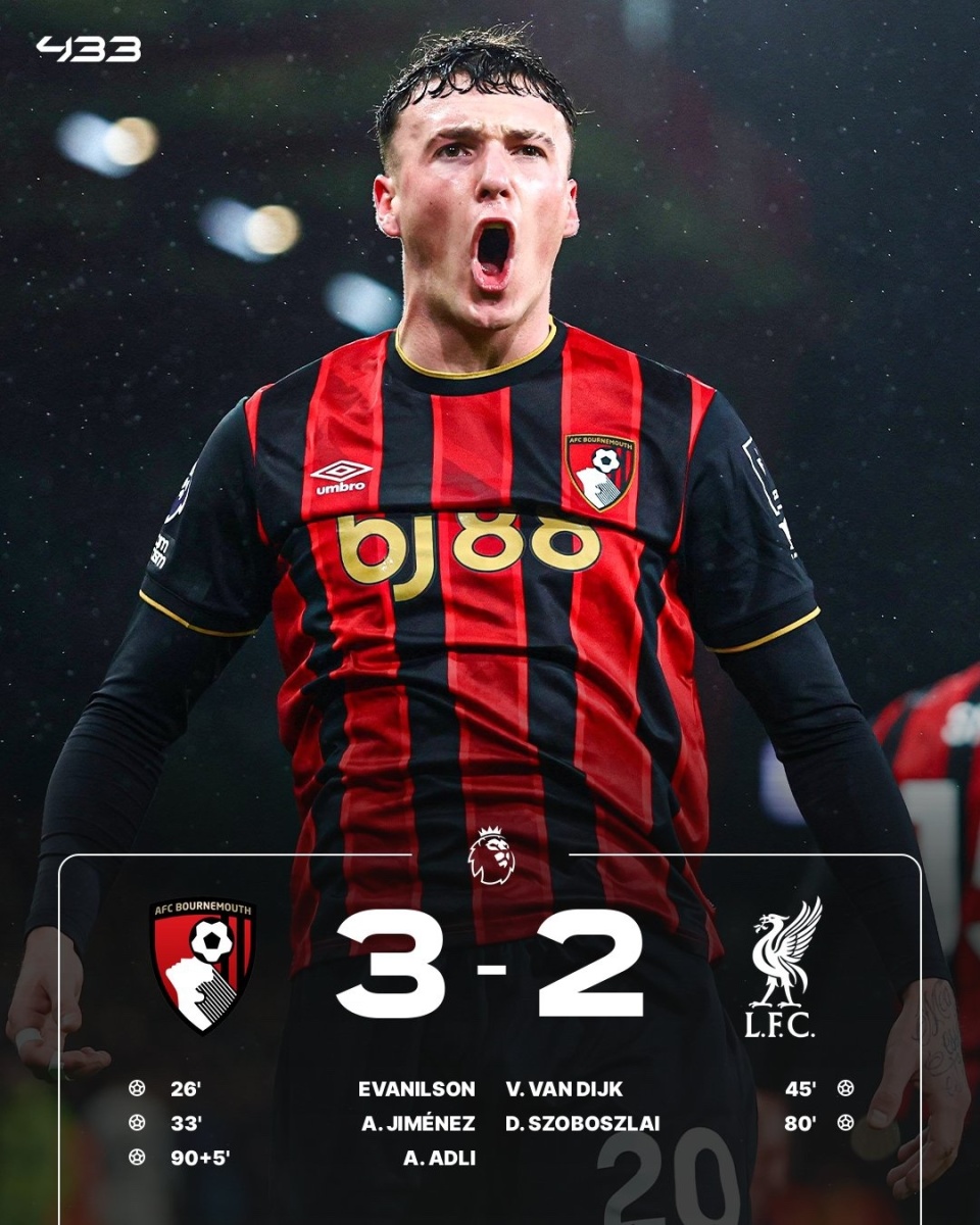 英超第23轮,利物浦客场2-3不敌伯恩茅斯,5轮联赛4平1负未尝胜绩。埃瓦尼尔森首开纪录,阿莱克斯-希门尼斯扩大领先优势,戈麦斯伤退,范戴克扳回一城,索博斯洛伊任意球破门扳平比分,阿德利补时读秒绝杀。