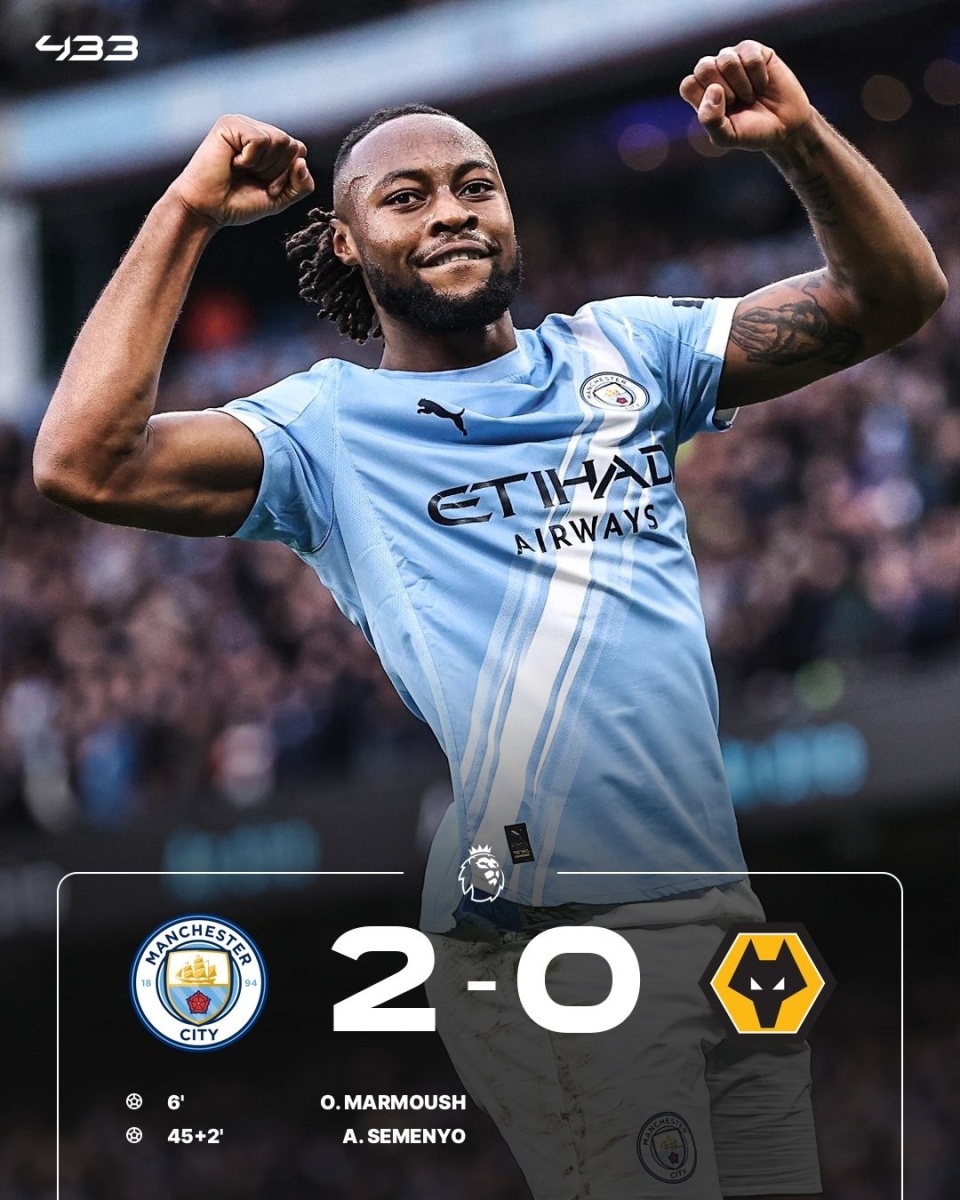 英超第23轮,曼城主场2-0狼队,结束4轮不胜,先赛一场距榜首4分。努内斯助攻马尔穆什破门,马尔穆什立柱,莫斯克拉禁区内手球,VAR介入,主裁判观看大屏幕后示意没有点球,塞梅尼奥再下一城+击中横梁。