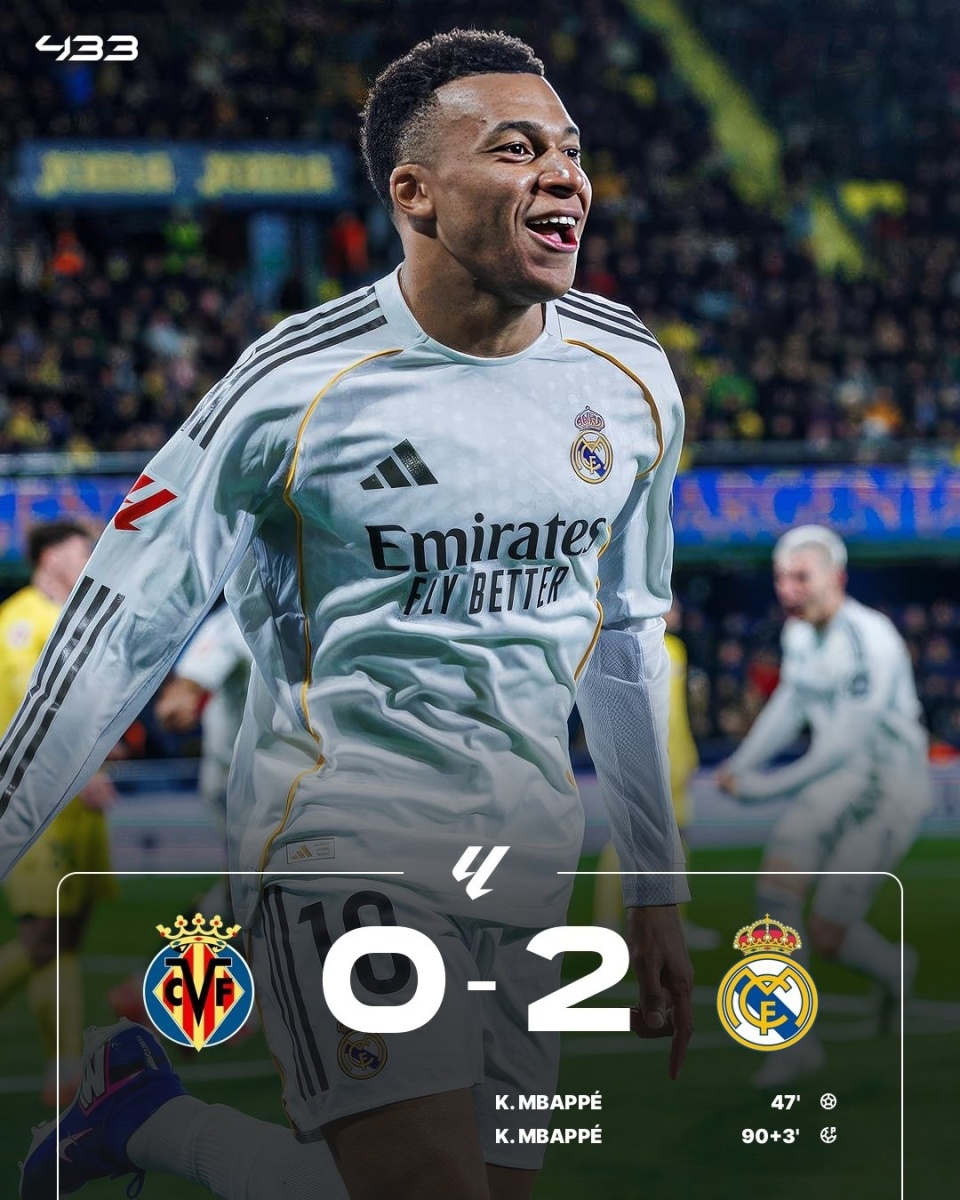 西甲第21轮,皇马客场2-0击败比利亚雷亚尔,先赛暂登顶,2分领跑积分榜。上半场双方均无建树,下半场,姆巴佩闪击破门,补时阶段,姆巴佩造点亲自主罚命中。