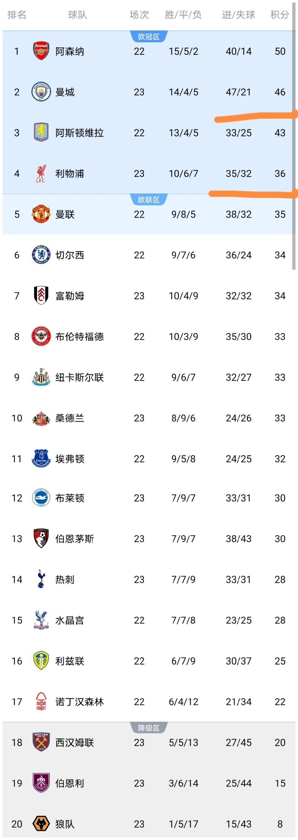 昨晚至今天凌晨,英超第23轮率先结束多场较量,曼城、利物浦、热刺等队出战。赛后英超积分榜发生变化,我们来看看。