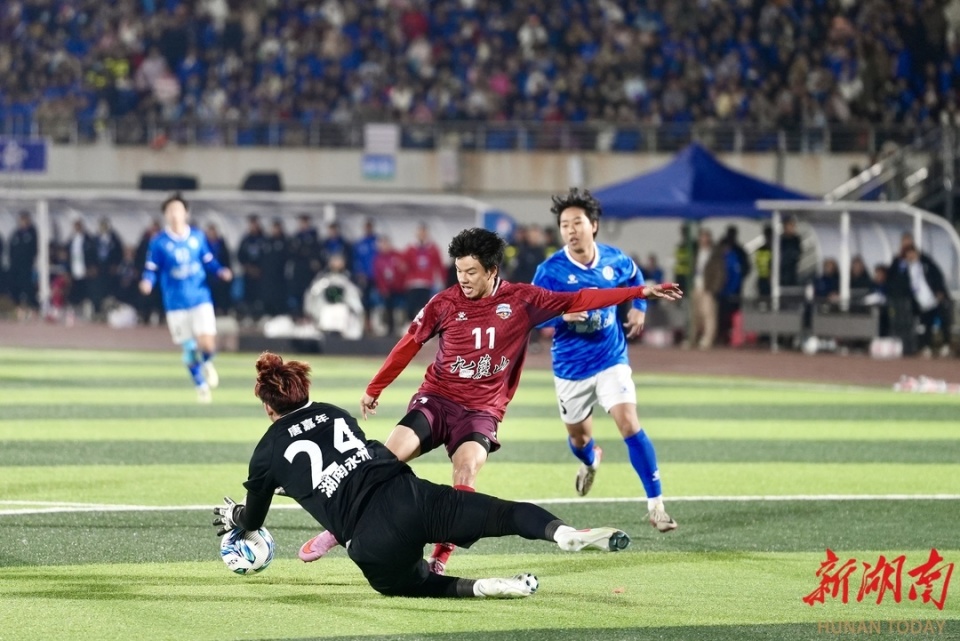 下半场,永州队秦维康一脚高质量爆射冲破防线,为球队扳回一城。现场解说员那句“永州队后防线队员堪称‘带刀侍卫’”,生动映照着“永州不大,创造神话”的热血宣言。