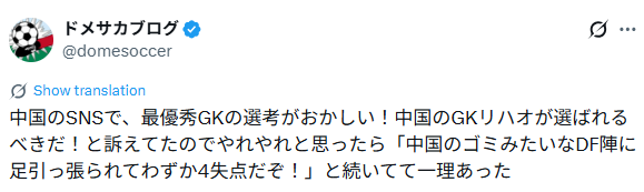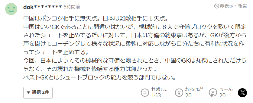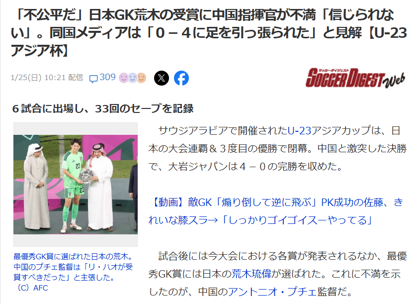 其实很多日本人也都在认真评价那名中国门将,就算没有拿到奖项,真正懂球的人还是会看得出来,所以希望能把这点牢记在心,那些只会让人留下坏印象的发言,本身就是对体育精神的亵渎。