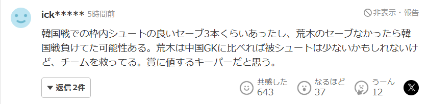 在对阵韩国的比赛中,荒木至少有三次相当精彩的扑救,如果没有他的那些关键扑救,日本队很可能已经输掉了那场对韩国的半决赛相比中国门将,荒木面对的射门次数也许确实更少,但他也是在真正拯救球队。我认为他是完全配得上那个奖项的门将。