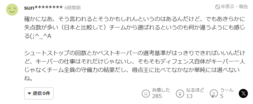 确实啊被这么一说,确实也有“好像是这么回事”的感觉,但从一个失球数明显更多(和日本相比)的球队里选人,又总觉得哪里不太对。要是能把扑救次数之类的最佳门将评选标准明确下来就好了,可门将的工作又不仅仅是扑救,而且防守本来就不是门将一个人的事,而是全队整体防守能力的体现,所以和只看进球数就能决定的金靴相比,门将的评选确实没法那么简单。
