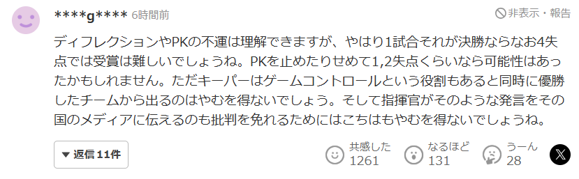 不过话说回来,不管过程如何,结果是丢了4球,在观感上确实还是稍显逊色。我当然非常清楚,失球绝对不只是门将一个人的问题。但要是情绪化地喊“不公平”,听起来就会让人觉得好像日本做了什么不正当的事一样,让人很不舒服。
