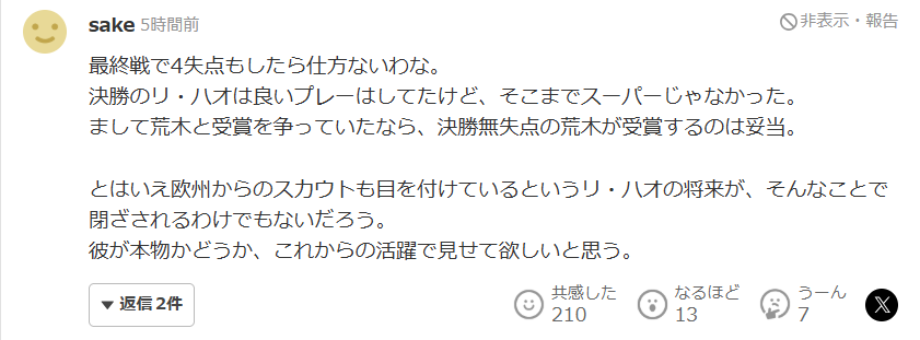 决赛一场就丢了4球,那也确实没办法了。决赛中的李昊确实有不错的发挥,但还称不上是那种“超级神级”的表现。更何况如果是和荒木竞争奖项的话,决赛零封的荒木获奖是合理的。当然,既然已经有欧洲的球探在关注李昊了,他的未来也不可能因为这种事就被堵死。他到底是不是货真价实的强者,还是希望他能在今后的表现中亲自证明给大家看。