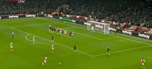 第65分钟,萨卡右路传中,赖斯不停球怒射,皮球高出横梁,直接飞出了底线。