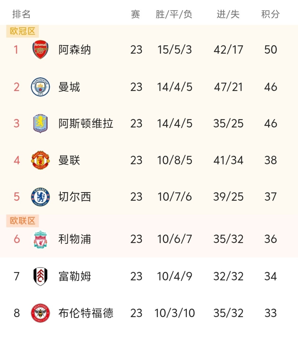 北京时间1月26日,英超联赛第23轮战罢,红魔曼联客场3-2绝杀了领头羊阿森纳,让阿森纳遭遇了本赛季的主场首败,目前阿森纳4分领跑,本轮被曼城缩小了差距,曼联目前10胜8平5负积38分,超越了利物浦,排名第4,曼联的进步太大了,切尔西客场3-1击败了水晶宫,这样以来,本轮利物浦被挤出了前5,利物浦和阿森纳这轮都不顺啊!