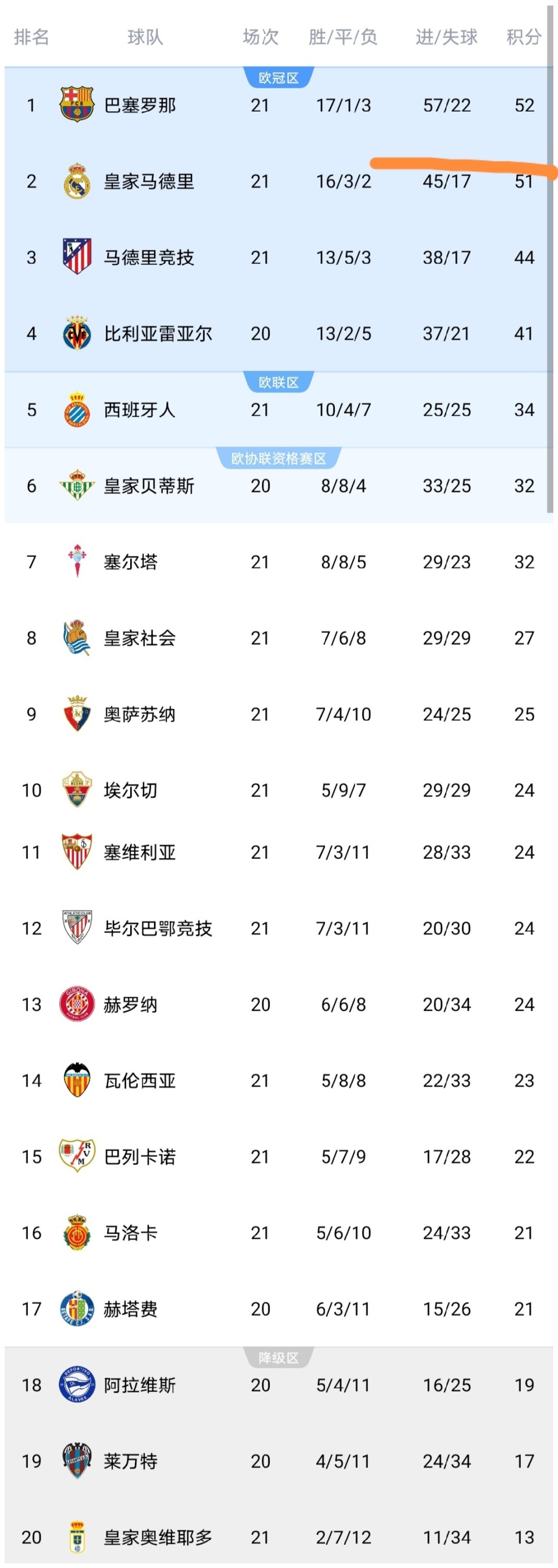 可以看到巴萨击败皇家奥维耶多队之后,积分上涨到了52分,又从皇马手中夺回了榜首的宝座,而皇家奥维耶多输球之后继续垫底。马竞取得胜利之后积分上涨到了44分,反超比利亚雷亚尔队升至了第3,而马略卡输球之后积21分排名第16。塞尔塔输球之后积32分排名第7,无缘反超西班牙人升至第5,这显然是天助西班牙人,而皇家社会队赢球之后积27分排名第8,逼近前六,也就是逼近欧战席位区了。