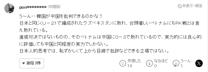 “嗯……韩国真的有资格批评中国吗?他们输给了乌兹别克斯坦,而乌兹别克斯坦和日本一样,都是由U21球员组成的;他们也输给了迅速崛起的越南,而越南以0-3的比分输给了中国。所以,即使我们客观评价他们的实力,他们(中韩)也只能和中国处于同一水平。”