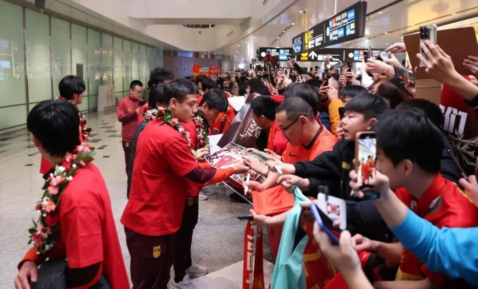 在北京大兴国际机场,众多球迷身穿国家队红色球衣、手持鲜花前来接机,现场汇成一片红色海洋。